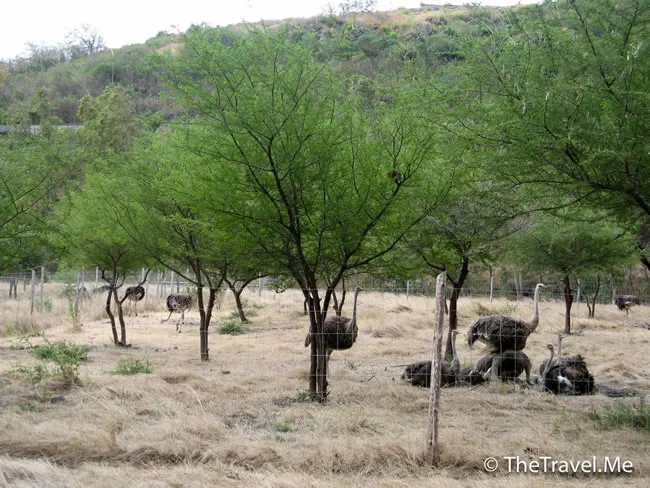 觀光車駛經一堆給鐵絲網圍著的鴕鳥後,停在一個如監獄般的圍牆旁。