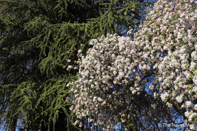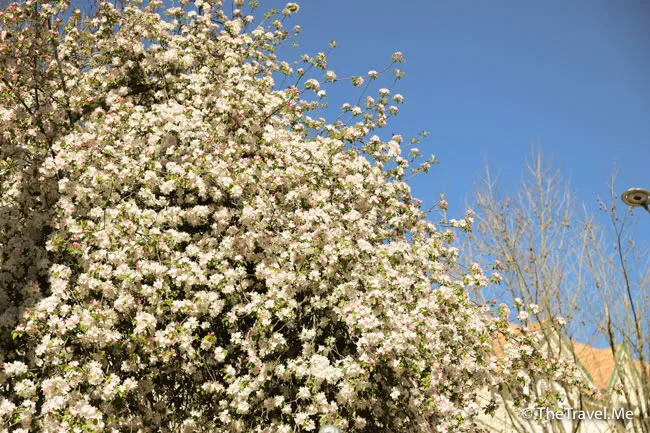 路邊有幾棵滿開的櫻花樹,非常漂亮,將本來平平無奇的街頭點綴得熱鬧艷麗。