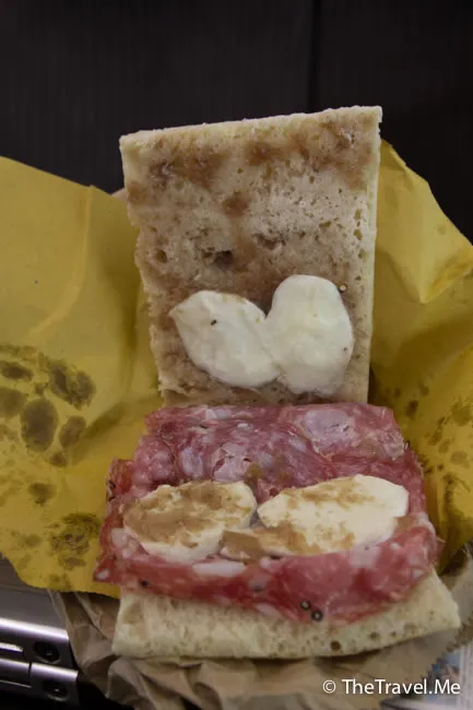 三文治留到在火車上才食,雖然已過了個多小時,麵包仍然鬆軟,莎洛美腸同店員推介的洋蔥醬非常夾,味道層次豐富,而且材料多,啖啖滋味,大家如果到翡冷翠,一定要去幫襯。
