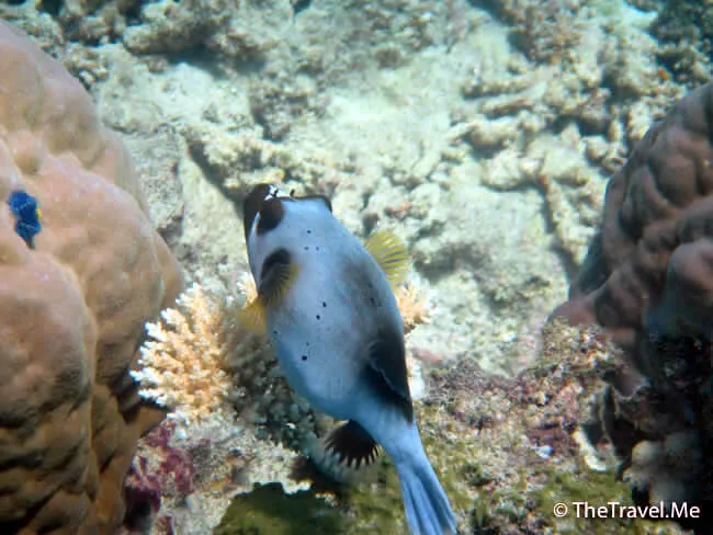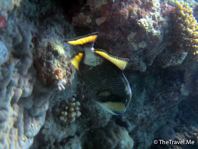 身邊忽然游來一條藍黃色的漂亮大魚,粗眉仔認得這種魚,這種魚叫鱗魨(Triggerfish)。