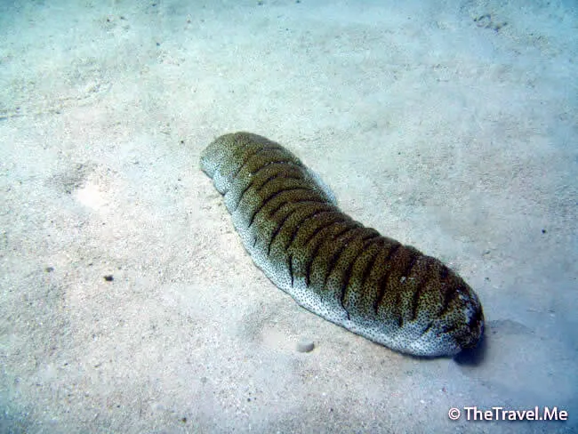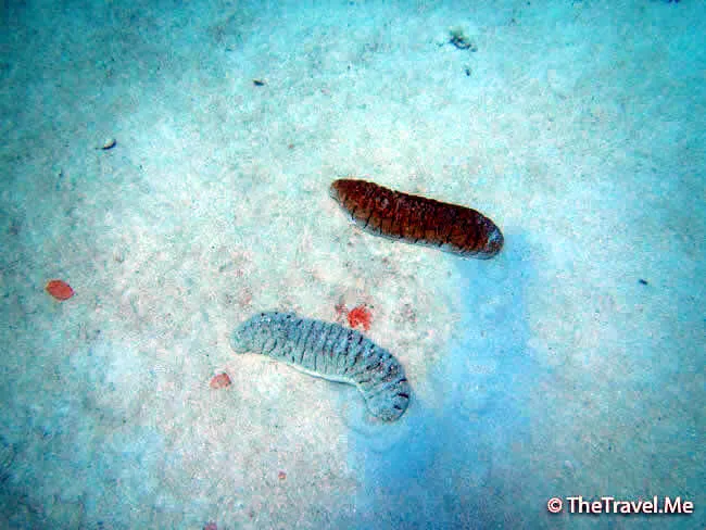 海底上有些超大海參,形態各異,顏色不同,頗為漂亮。