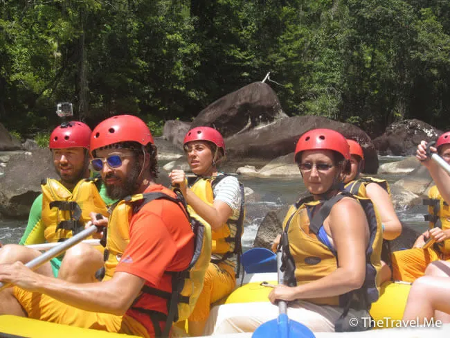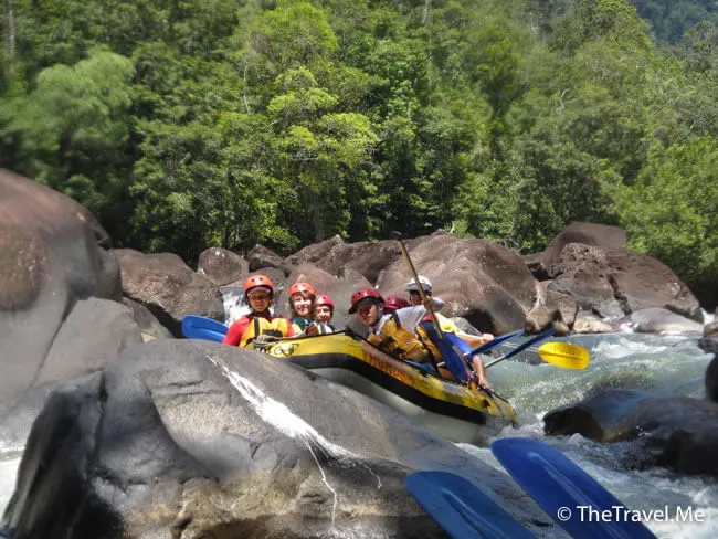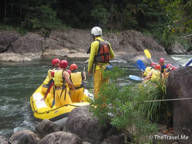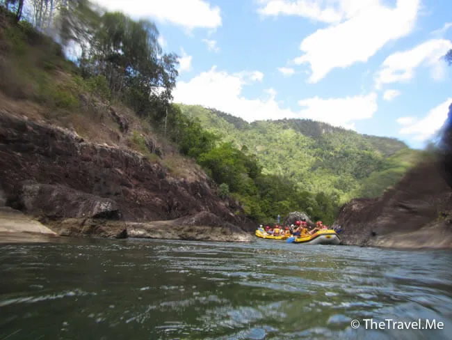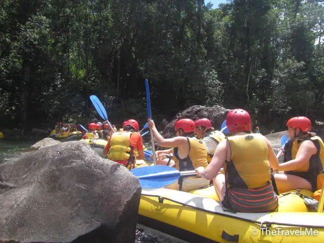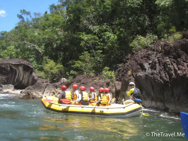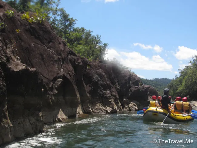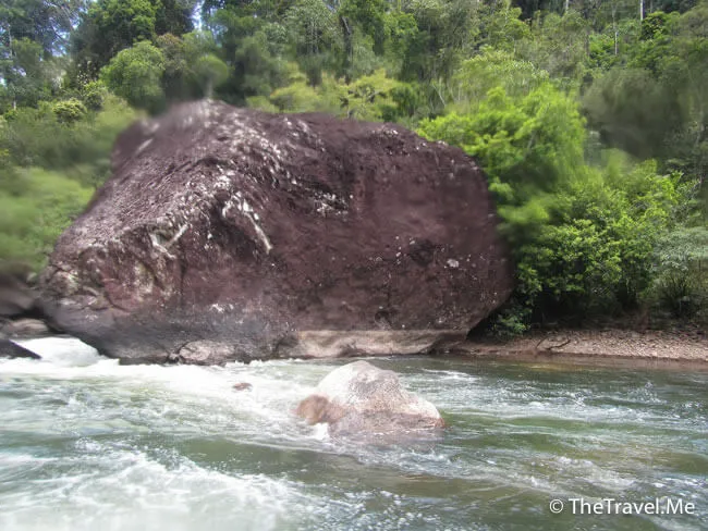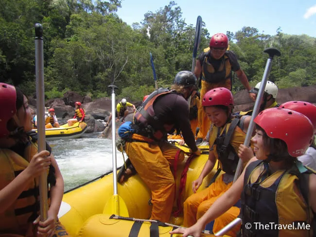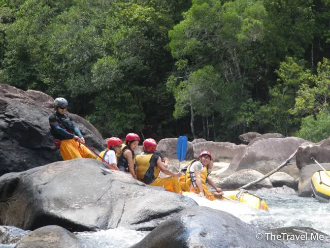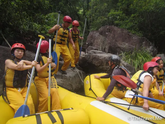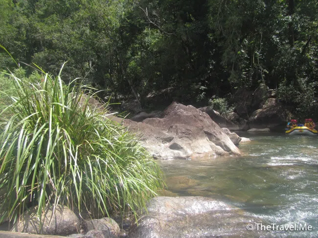 因為是枯水期,河水不算充沛,橡皮艇偶然會擱淺,要七個人合力跳幾下才能繼續旅程。