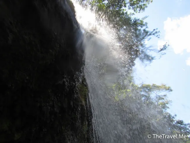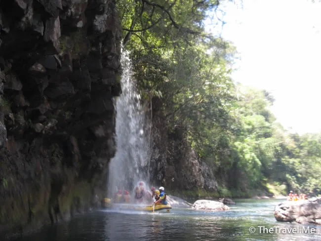 在船長的指示下,橡皮艇在瀑布下面駛過,瀑布水力驚人,打得人人都抬不起頭來。