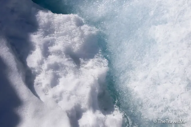 在陽光的作用下,冰壁呈現典雅憂鬱的湖水綠。