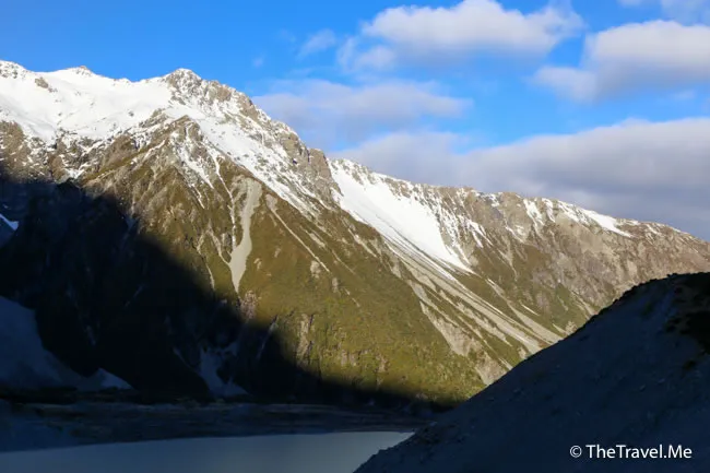 前面是慕拿湖(Muller Lake),因為陽光照耀不到,呈暗綠一片。